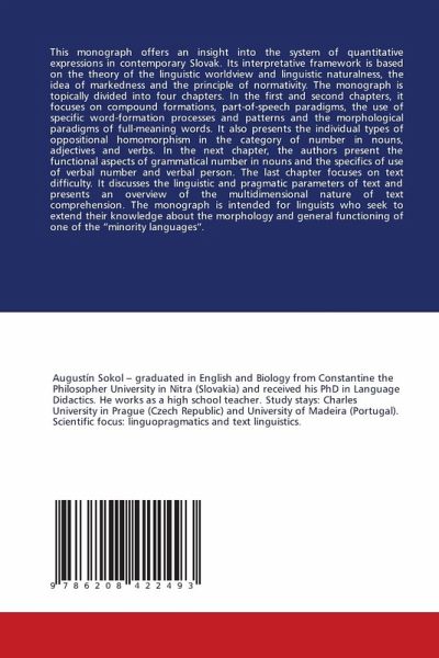 This monograph offers an insight into the system of quantitative expressions in contemporary Slovak. Its interpretative framework is based on the theory of the linguistic worldview and linguistic naturalness, the idea of markedness and the principle of normativity. The monograph is topically divided into four chapters. In the first and second chapters, it focuses on compound formations, part-of-speech paradigms, the use of specific word-formation processes and patterns and the morphological paradigms of full-meaning words. It also presents the individual types of oppositional homomorphism in the category of number in nouns, adjectives and verbs. In the next chapter, the authors present the functional aspects of grammatical number in nouns and the specifics of use of verbal number and verbal person. The last chapter focuses on text difficulty. It discusses the linguistic and pragmatic parameters of text and presents an overview of the multidimensional nature of text comprehension.The monograph is intended for linguists who seek to extend their knowledge about the morphology and general functioning of one of the "minority languages".