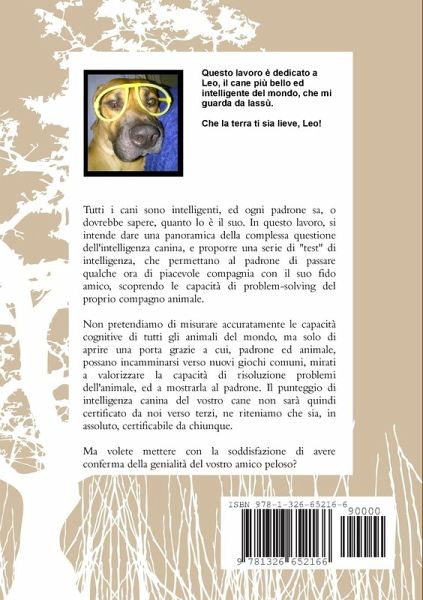Tutti i cani sono intelligenti, ed ogni padrone sa, o dovrebbe sapere, quanto lo è il suo. In questo lavoro, si intende dare una panoramica, necessariamente riduttiva e non esaustiva, della complessa questione dell'intelligenza canina, e proporre una serie di "test" di intelligenza, che permettano al padrone di passare qualche ora di piacevole compagnia con il suo fido amico, scoprendo le capacità di problem-solving del proprio compagno animale. Non pretendiamo di misurare accuratamente le capacità cognitive di tutti gli animali del mondo, ma solo di aprire una porta grazie a cui, padrone ed animale, possano incamminarsi verso nuovi giochi comuni, mirati a valorizzare la capacità di risoluzione problemi dell'animale, ed a mostrarla al padrone. Nel testo, dopo un preambolo su cosa sia (o meglio, su come vediamo) l'intelligenza canina, ed una disamina delle razze più intelligenti, proponiamo una serie di test, grazie ai quali calcolare il punteggio di intelligenza canina del vostro animale.