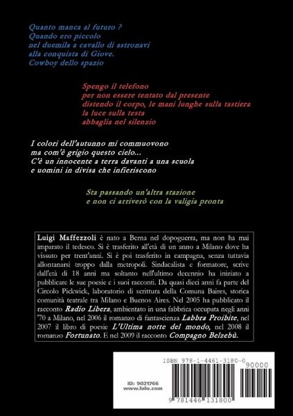 32 poesie, tra la brughiera lombarda e la metropoli, per parlare di presente e dell'assenza di futuro. Maffezzoli torna alla poesia con un libro più maturo e malinconico che emoziona e fa pensare. Il ricavato dalle vendite verrà devoluto al progetto: