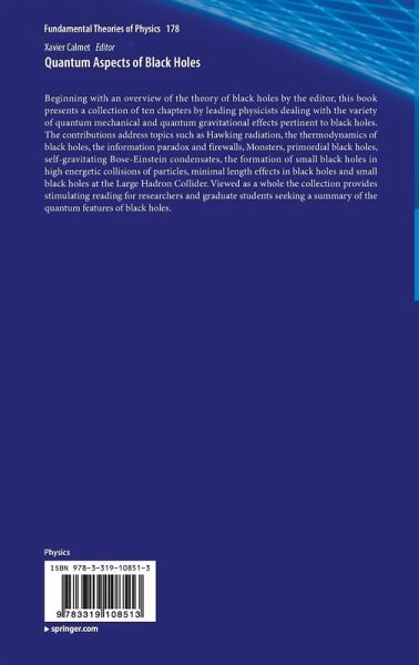 Beginning with an overview of the theory of black holes by the editor, this book presents a collection of ten chapters by leading physicists dealing with the variety of quantum mechanical and quantum gravitational effects pertinent to black holes. The contributions address topics such as Hawking radiation, the thermodynamics of black holes, the information paradox and firewalls, Monsters, primordial black holes, self-gravitating Bose-Einstein condensates, the formation of small black holes in high energetic collisions of particles, minimal length effects in black holes and small black holes at…mehr