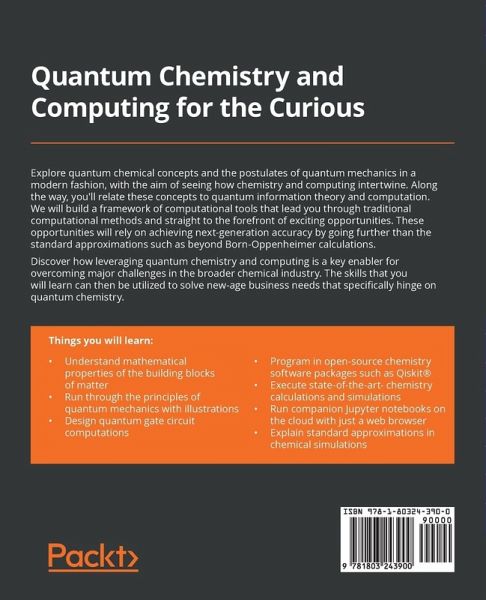 Acquire knowledge of quantum chemistry concepts, the postulates of quantum mechanics, and the foundations of quantum computing, and execute illustrations made with Python code, Qiskit, and open-source quantum chemistry packages Key Features:Be at the forefront of a quest for increased accuracy in chemistry applications and computing Get familiar with some open source quantum chemistry packages to run your own experiments Develop awareness of computational chemistry problems by using postulates of quantum mechanics Book Description: Explore quantum chemical concepts and the postulates of quantum mechanics in a modern fashion, with the intent to see how chemistry and computing intertwine. Along the way you'll relate these concepts to quantum information theory and computation. We build a framework of computational tools that lead you through traditional computational methods and straight to the forefront of exciting opportunities. These opportunities will rely on achieving next-generation accuracy by going further than the standard approximations such as beyond Born-Oppenheimer calculations. Discover how leveraging quantum chemistry and computing is a key enabler for overcoming major challenges in the broader chemical industry. The skills that you will learn can be utilized to solve new-age business needs that specifically hinge on quantum chemistry What You Will Learn:Understand mathematical properties of the building blocks of matter Run through the principles of quantum mechanics with illustrations Design quantum gate circuit computations Program in open-source chemistry software packages such as Qiskit® Execute state-of-the-art-chemistry calculations and simulations Run companion Jupyter notebooks on the cloud with just a web browser Explain standard approximations in chemical simulations Who this book is for: Professionals interested in chemistry and computer science at the early stages of learning, or interested in a career of quantum computational chemistry and quantum computing, including advanced high school and college students. Helpful to have high school level chemistry, mathematics (algebra), and programming. An introductory level of understanding Python is sufficient to read the code presented to illustrate quantum chemistry and computing