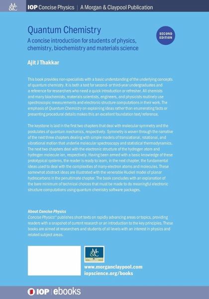This book provides non-specialists with a basic understanding ofthe underlying concepts of quantum chemistry. It is both a text for second or third-year undergraduates and a reference for researchers who need a quick introduction or refresher. All chemists and many biochemists, materials scientists, engineers, and physicists routinely user spectroscopic measurements and electronic structure computations in their work. The emphasis of Quantum Chemistry on explaining ideas rather than enumerating facts or presenting procedural details makes this an excellent foundation text/reference. The keystone is laid in the first two chapters which deal with molecular symmetry and the postulates of quantum mechanics, respectively. Symmetry is woven through the narrative of the next three chapters dealing with simple models of translational, rotational, and vibrational motion that underlie molecular spectroscopy and statistical thermodynamics. The next two chapters deal with the electronic structure of the hydrogen atom and hydrogen molecule ion, respectively. Having been armed with a basic knowledge of these prototypical systems, the reader is ready to learn, in the next chapter, the fundamental ideas used to deal with the complexities of many-electron atoms and molecules. These somewhat abstract ideas are illustrated with the venerable Huckel model of planar hydrocarbons in the penultimate chapter. The book concludes with an explanation of the bare minimum of technical choices that must be made to do meaningful electronic structure computations using quantum chemistry software packages.