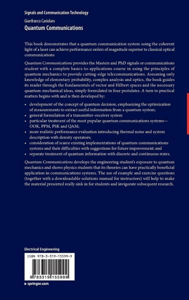 Quantum Communications develops the engineering student's exposure to quantum mechanics and shows physics students that its theories can have practically beneficial application in communications systems. The use of example and exercise questions (together with a downloadable solutions manual for instructors, available from http://extras.springer.com/) will help to make the material presented really sink in for students and invigorate subsequent research.