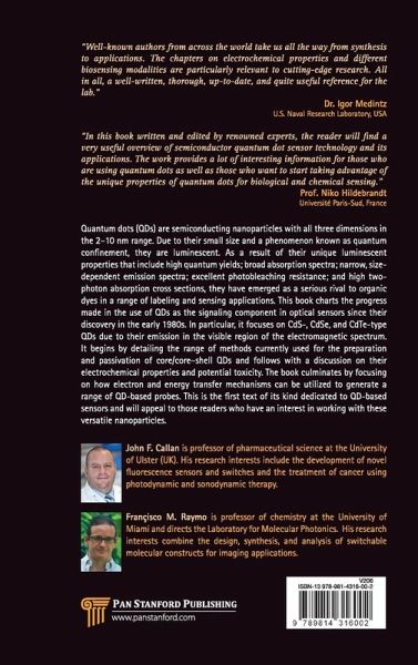 Consisting of six chapters, written by experts in their field, this book charts the progress made in the use of quantum dots as the signaling component in optical sensors since their discovery in the early 1980s. In particular, it focuses on CdS-, CdSe-, and CdTe-type QDs due to their emission in the visible region of the electromagnetic spectrum. The book begins by detailing the range of methods currently used for the preparation and passivation of core/core-shell quantum dots and follows with a discussion on their electrochemical properties and potential toxicity. The book culminates by focusing on how electron and energy transfer mechanisms can be utilized to generate a range of quantum dot-based probes. This is the first text of its kind dedicated to quantum dot-based sensors and will appeal to those readers who have an interest in working with these versatile nanoparticles.