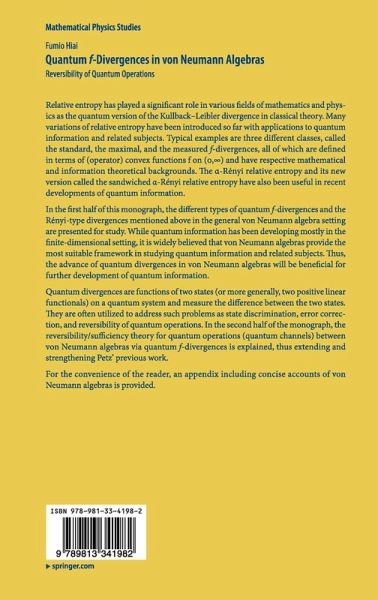 "The presentation of this monograph is very friendly, since it is addressed to a large audience made up of mathematicians and physicists, with a generous set of appendices on the basics of von Neumann algebras, positive self-adjoint operators (unbounded) in Hilbert spaces, operator convex functions on (0, 1), and operator connections with normal positive forms. It gathers updated information on f-divergences and it is very useful for specialists, although not exclusively." (Aurelian Gheondea, Mathematical Reviews, October, 2022)