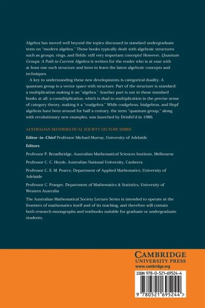 Algebra has moved well beyond the topics discussed in standard undergraduate texts on ‘modern algebra’. Those books typically dealt with algebraic structures such as groups, rings and fields: still very important concepts! However Quantum Groups: A Path to Current Algebra is written for the reader at ease with at least one such structure and keen to learn the latest algebraic concepts and techniques. A key to understanding these new developments is categorical duality. A quantum group is a vector space with structure. Part of the structure is standard: a multiplication making it an ‘algebra’. Another part is not in those standard books at all: a comultiplication, which is dual to multiplication in the precise sense of category theory, making it a ‘coalgebra’. While coalgebras, bialgebras and Hopf algebras have been around for half a century, the term ‘quantum group’, along with revolutionary new examples, was launched by Drinfel'd in 1986.
