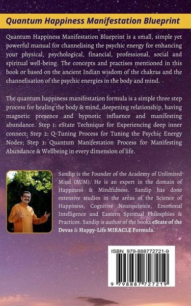Quantum Happiness Manifestation Blueprint is a small, simple yet powerful manual for channelising the psychic energy for enhancing your physical, psychological, financial, professional, social and spiritual well-being. The concepts and practises mentioned in this book or based on the ancient Indian wisdom of the chakras and the channelisation of the psychic energies in the body and mind. The quantum happiness manifestation formula is a simple three step process for healing the body & mind, deepening relationship, having magnetic presence and hypnotic influence and manifesting abundance. Step 1: eState Technique for Experiencing deep inner connect; Step 2: Q-Tuning Process for Tuning the Psychic Energy Nodes; Step 3: Quantum Manifestation Process for Manifesting Abundance & Wellbeing in every dimension of life.