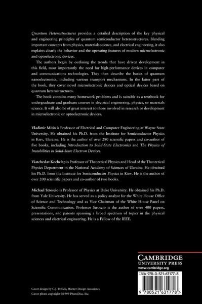 Quantum Heterostructures provides a detailed description of the key physical and engineering principles of quantum semiconductor heterostructures. Blending important concepts from physics, materials science, and electrical engineering, it also explains clearly the behaviour and operating features of modern microelectronic and optoelectronic devices. The authors begin by outlining the trends that have driven development in this field, most importantly the need for high-performance devices in computer, information, and communications technologies. They then describe the basics of quantum nanoelectronics, including various transport mechanisms. In the latter part of the book, they cover novel microelectronic devices, and optical devices based on quantum heterostructures. The book contains many homework problems and is suitable as a textbook for undergraduate and graduate courses in electrical engineering, physics, or materials science. It will also be of great interest to those involved in research or development in microelectronic or optoelectronic devices.