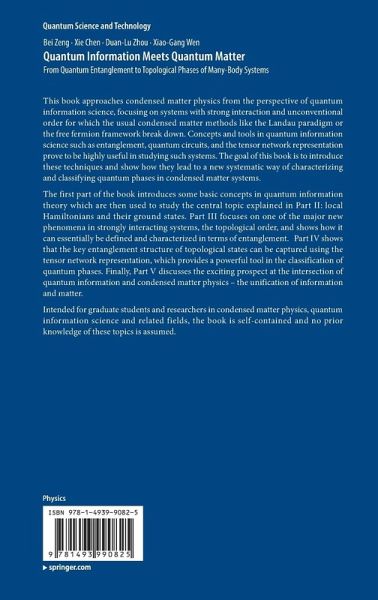 Part I Basic Concepts in Quantum Information Theory.- 1 Correlation and Entanglement.- 2 Evolution of Quantum Systems.- 3 Quantum Error-Correcting Codes.- Part II Local Hamiltonians, Ground States and Many-body Entanglement.- 4 Local Hamiltonians and Ground States.- 5 Gapped Quantum Systems and Entanglement Area Law.- Part III Topological order and Long-Range Entanglement.- 6 Introduction to Topological order.- 7 Local Transformations and Long-Range Entanglement.- Part IV Gapped Topological Phases and Tensor Network.- 8 Matrix Product State and 1D Gapped Phase.- 9 Tensor Product States and 2D Gapped Phases.- 10 Symmetry Protected Topological Phases.- Part V Outlook.- 11 A Unification of Information and Matter.