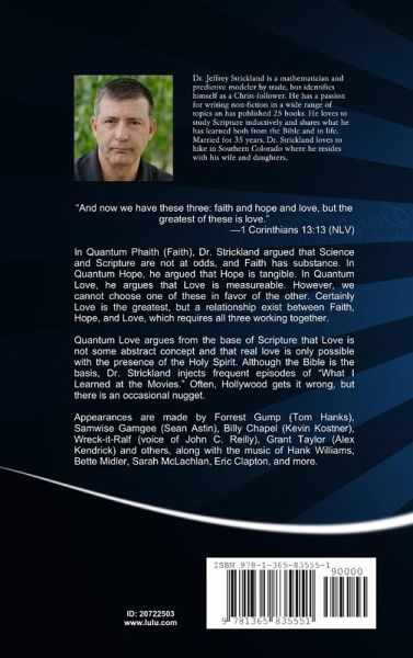 In Quantum Phaith (Faith), Dr. Strickland argued that Science and Scripture are not at odds and Faith has substance. In Quantum Hope, he argued that Hope is tangible. In Quantum Love, he argues that Love is measureable. However, we cannot choose one of these in favor of the other. Certainly Love is the greatest, but a relationship exist between Faith, Hope, and Love, which requires all three working together. Quantum Love argues from the base of Scripture that Love is not some abstract concept and that real love is only possible with the presence of the Holy Spirit. Although the Bible is the…mehr