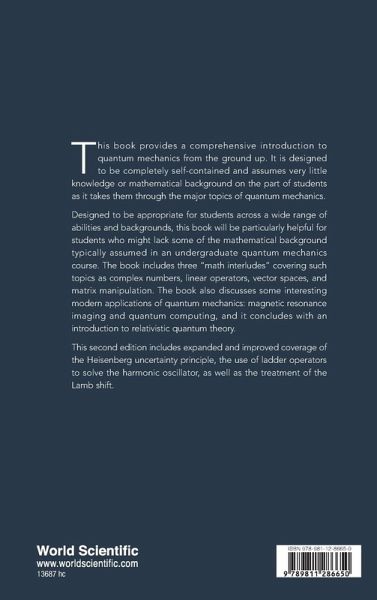 This book provides a comprehensive introduction to quantum mechanics from the ground up. It is designed to be completely self-contained and assumes very little knowledge or mathematical background on the part of students as it takes them through the major topics of quantum mechanics. Designed to be appropriate for students across a wide range of abilities and backgrounds, this book will be particularly helpful for students who might lack some of the mathematical background typically assumed in an undergraduate quantum mechanics course. The book includes three "math interludes" covering such topics as complex numbers, linear operators, vector spaces, and matrix manipulation. The book also discusses some interesting modern applications of quantum mechanics: magnetic resonance imaging and quantum computing, and it concludes with an introduction to relativistic quantum theory. This second edition includes expanded and improved coverage of the Heisenberg uncertainty principle, the use of ladder operators to solve the harmonic oscillator, as well as the treatment of the Lamb shift.
