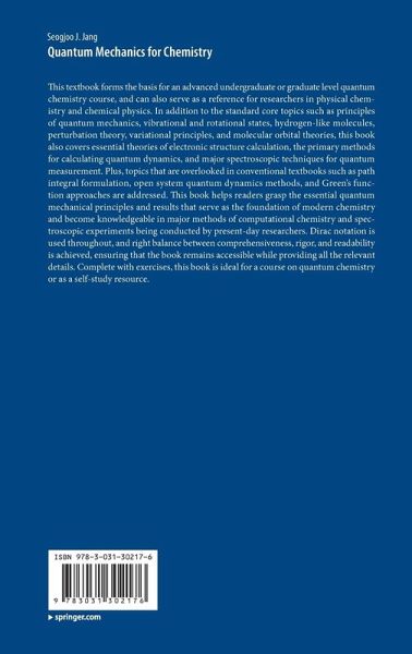This textbook forms the basis for an advanced undergraduate or graduate level quantum chemistry course, and can also serve as a reference for researchers in physical chemistry and chemical physics. In addition to the standard core topics such as principles of quantum mechanics, vibrational and rotational states, hydrogen-like molecules, perturbation theory, variational principles, and molecular orbital theories, this book also covers essential theories of electronic structure calculation, the primary methods for calculating quantum dynamics, and major spectroscopic techniques for quantum measurement. Plus, topics that are overlooked in conventional textbooks such as path integral formulation, open system quantum dynamics methods, and Green's function approaches are addressed. This book helps readers grasp the essential quantum mechanical principles and results that serve as the foundation of modern chemistry and become knowledgeable in major methods of computational chemistryand spectroscopic experiments being conducted by present-day researchers. Dirac notation is used throughout, and right balance between comprehensiveness, rigor, and readability is achieved, ensuring that the book remains accessible while providing all the relevant details. Complete with exercises, this book is ideal for a course on quantum chemistry or as a self-study resource.