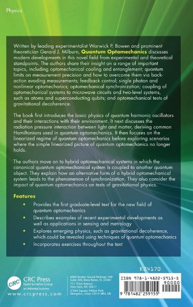 "The field of quantum optomechanics has exploded in the last few years with applications from exploring the relationship between quantum mechanics and gravity to precision sensing and the detection of the weakest signals in the universe. Bowen and Milburn's book is excellent and timely, introducing the reader to the fundamental concepts and methodologies and their application before probing ideas at a deeper level. With a range of well-set exercises, it will become a must-have advanced textbook as well as a splendid reference for the expert."