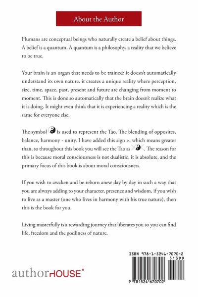 Humans are conceptual beings who naturally create a belief about things. A belief is a quantum. A quantum is a philosophy, a reality that we believe to be true. Your brain is an organ that needs to be trained. It doesn't automatically understand its own nature. It creates a unique reality where perception, size, time, space, past, present, and future are changing from moment to moment. This is done so automatically the brain doesn't realize what it is doing. It might even think that it is experiencing a reality, which is the same for everyone else. The symbol yin-yang is used to represent the Tao-the blending of opposites, balance, harmony, and unity. I have added this sign >, which means greater than, so throughout this book, you will see the Tao as > yin-yang. The reason for this is because moral consciousness is not dualistic. It is absolute, and the primary focus of this book is about moral consciousness. If you wish to awaken and be reborn anew day by day in such a way that you are always adding to your character, presence, and wisdom and if you wish to live as a master (one who lives in harmony with his true nature), then this is the book for you. Living masterfully is a rewarding journey that liberates you so you can find life, freedom, and the godliness of nature.