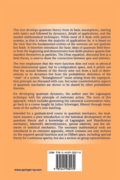 The combination of quantum mechanics and quantum ?eld theory cons- tutesthemostrevolutionaryandin?uentialphysicaltheoryofthetwentieth century. Itsimpactisfeltnotonlyinalmostallothersciences,butthefruits of its application are ubiquitous in everyday life. This textbook is designed to teach graduate students the underlying quantum-physical ideas, their mathematical formulations, and the basic problem-solving techniques of the discipline. It assumes they have taken at least one introductory course in quantum mechanics as undergraduates and are familiar with the history of the subject and the basic experimental evidence that led to its adoption, as well as with many of its fundamental notions. In contrast to most other authors, I am therefore not introducing the quantum theory via an hist- ical survey of its early successes. Instead, following the models of books on classsical mechanics or electromagnetism, I develop the theory from its basic assumptions, beginning with statics, followed by the dynamics and details of its speci?c areas of use as well as the needed mathematical te- niques. Although this book, inevitably, deals largely with the behavior of point particles under various conditions, I do not regard particles as the fun- mental entities of the universe: the most basic object is the quantum ?eld, with theobserved particlesarising from the?eld asitsquanta. For thisr- son I introduce quantum ?elds right from the beginning and demonstrate, in the ?rst chapter, how particles originate.