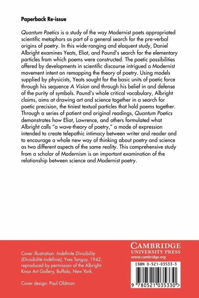 Quantum Poetics is a study of the way Modernist poets appropriated scientific metaphors as part of a general search for the pre-verbal origins of poetry. In this wide-ranging and eloquent study, leading Modernist scholar Daniel Albright examines Yeats's, Eliot's, and Pound's search for the elementary particles from which poems were constructed. The poetic possibilities offered by developments in scientific discourse intrigued a Modernist movement intent on remapping the theory of poetry. Using models supplied by physicists, Yeats sought for the basic units of poetic force through his sequence A Vision and through his belief in and defense of the purity of symbols. Pound's whole critical vocabulary, Albright claims, aims at drawing art and science together in a search for poetic precision, the tiniest textual particles that held poems together. Through a series of patient and original readings, Quantum Poetics demonstrates how Eliot, Lawrence, and others formulated what Albright calls "a wave-theory of poetry", a mode of expression intended to create telepathic intimacy between writer and reader and to encourage a whole new way of thinking about poetry and science as two different aspects of the same reality. This comprehensive study from a leading scholar of Modernism is a fresh examination of the relationship between science and Modernist poetry.