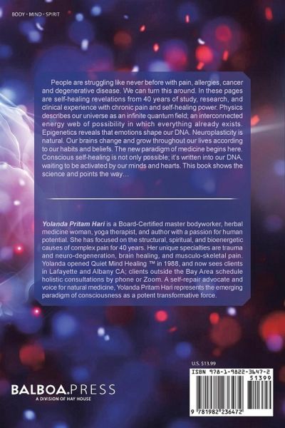 People are struggling like never before with pain, allergies, cancer and degenerative disease. We can turn this around. In these pages are self-healing revelations from 40 years of study, research, and clinical experience with chronic pain and self-healing power. Physics describes our universe as an infinite quantum field; an interconnected energy web of possibility in which everything already exists. Epigenetics reveals that emotions shape our DNA. Neuroplasticity is natural. Our brains change and grow throughout our lives according to our habits and beliefs. The new paradigm of medicine begins here. Conscious self-healing is not only possible; it's written into our DNA, waiting to be activated by our minds and hearts. This book shows the science and points the way...