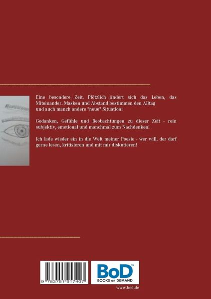 Eine besondere Zeit. Plötzlich ändert sich das Leben, das Miteinander. Masken und Abstand bestimmen den Alltag und auch manch andere "neue" Situation!Gedanken, Gefühle und Beobachtungen zu dieser Zeit - rein subjektiv, emotional und manchmal zum Nachdenken! Ich lade wieder ein in die Welt meiner Poesie - wer will, der darf gerne lesen, kritisieren und mit mir diskutieren!