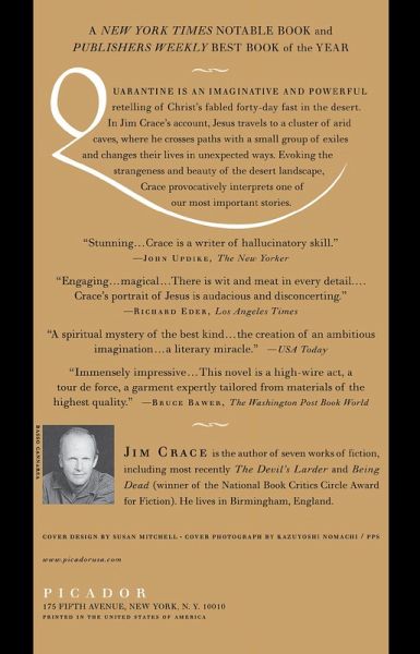 Winner of the Whitbread Novel of the Year and a Booker finalist: a controversial novel of faith and mystery about a group of desert travellers and their encounter with Jesus Quarantine is Jim Crace's imaginative and powerful retelling of Christ's fabled 40-day fast in the desert. In Crace's account, Jesus travels to a cluster of arid caves where he crosses paths with a small group of exiles who are on a pilgrimage to find redemption. One wealthy and manipulative quarantiner recognizes characteristics in Christ that he believes are divine. Evoking the strangeness and beauty of the desert landscape, Crace provocatively interprets one of our most important stories.
