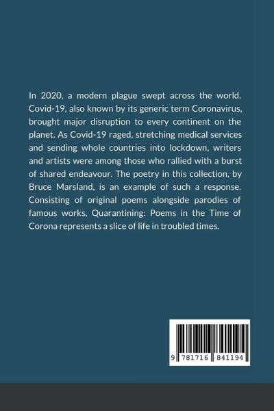 In 2020, a modern plague swept across the world. Covid-19, also known by its generic term Coronavirus, brought major disruption to every continent on the planet. As Covid-19 raged, stretching medical services and sending whole countries into lockdown, writers and artists were among those who rallied with a burst of shared endeavour. The poetry in this collection, by Bruce Marsland, is an example of such a response. Consisting of original poems alongside parodies of famous works, Quarantining: Poems in the Time of Corona represents a slice of life in troubled times.