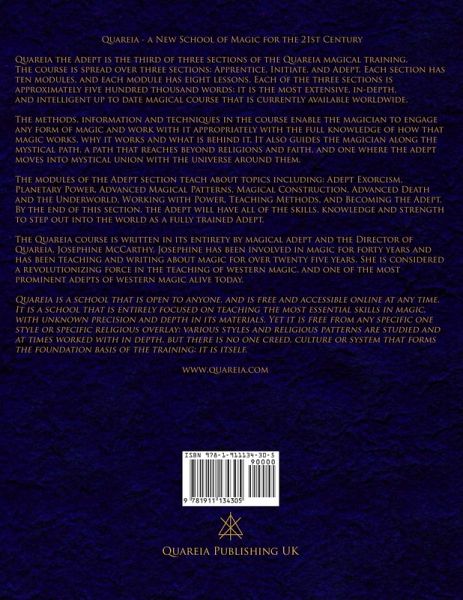 Quareia - a New School of Magic for the 21st Century Quareia the Adept is the third of three sections of the Quareia magical training. The course is spread over three sections: Apprentice, Initiate, and Adept. Each section has ten modules, and each module has eight lessons. Each of the three sections is approximately five hundred thousand words: it is the most extensive, in-depth, and intelligent up to date magical course that is currently available worldwide. The methods, information and techniques in the course enable the magician to engage any form of magic and work with it appropriately with the full knowledge of how that magic works, why it works and what is behind it. It also guides the magician along the mystical path, a path that reaches beyond religions and faith, and one where the adept moves into mystical union with the universe around them. The modules of the Adept section teach about topics including: Adept Exorcism, Planetary Power, Advanced Magical Patterns, Magical Construction, Advanced Death and the Underworld, Working with Power, Teaching Methods, and Becoming the Adept. By the end of this section, the Adept will have all of the skills, knowledge and strength to step out into the world as a fully trained Adept. The Quareia course is written in its entirety by magical adept and the Director of Quareia, Josephine McCarthy. Josephine has been involved in magic for forty years and has been teaching and writing about magic for over twenty five years. She is considered a revolutionizing force in the teaching of western magic, and one of the most prominent adepts of western magic alive today. Quareia is a school that is open to anyone, and is free and accessible online at any time. It is a school that is entirely focused on teaching the most essential skills in magic, with unknown precision and depth in its materials. Yet it is free from any specific one style or specific religious overlay: various styles and religious patterns are studied and at times worked with in depth, but there is no one creed, culture or system that forms the foundation basis of the training: it is itself.