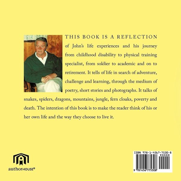This book is a reflection of John's life experiences and his journey from childhood disability to physical training specialist, from soldier to academic and on to retirement. It tells through the medium of poetry, short stories and photographs, of a life in search of adventure, challenge and learning. It talks of snakes, spiders, dragons, mountains, jungle, fern cloaks, poverty, education, life and death. It reflects on cause and effect, and experiences in many countries around the world including Europe, Africa and the Far East. The intention of the book is to make the reader think of his or her own life, the way they choose to live it and perhaps to write about it. All the stories are based on fact and the poems are designed to highlight the circumstances in which they were conceived. There is a little philosophical content to some of the work, but at no time is it patronising, misleading or dishonest. Any reference to religion is not orientated towards any particular faith, but towards the millions of people throughout the world who believe in the power of good.