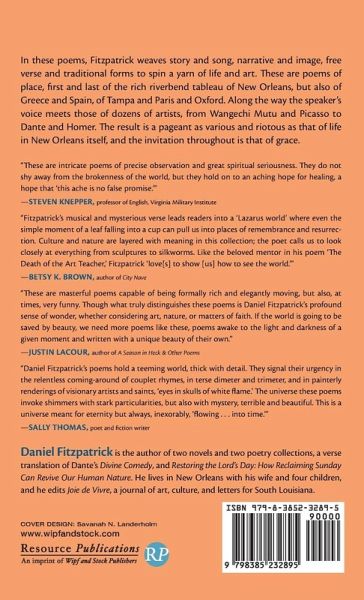 In these poems, Fitzpatrick weaves story and song, narrative and image, free verse and traditional forms to spin a yarn of life and art. These are poems of place, first and last of the rich riverbend tableau of New Orleans, but also of Greece and Spain, of Tampa and Paris and Oxford. Along the way the speaker's voice meets those of dozens of artists, from Wangechi Mutu and Picasso to Dante and Homer. The result is a pageant as various and riotous as that of life in New Orleans itself, and the invitation throughout is that of grace.