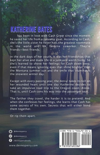 Katherine Gates has been in love with Cash Greer since the moment he saved her life from a runaway goat. According to Cash, she's the little sister he never had, the greatest roommate in the world and his favorite coworker. They're friends-best friends. In the dark days of her youth, it was her friendships that kept her alive and made life in a junkyard worth living. So she's learned to shove her feelings for Cash down deep, even if that means ignoring eyes that shine brighter than the Montana summer sun and the smile that illuminates the snowiest winter day. Except with every passing year, the denial takes its toll on her wounded heart until one day Katherine decides to take an impulsive road trip to the Oregon coast. Alone. That is, until Cash cons his way into the passenger seat. The farther they travel, the harder it is to pretend. And when she confesses her feelings, she learns that Cash has some secrets of his own. Secrets that will either bond them together. Or rip them apart.