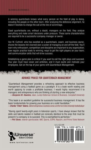 A winning quarterback knows what every person on the field of play is doing, including the people on the other team. After analyzing the defensive alignment, he doesn't hesitate to change the call at the line of scrimmage. Good quarterbacks are, without a doubt, managers on the field; they analyze everything and make smart decisions under pressure. These same characteristics are required to be a successful company manager or owner. Van W. Cuthrell, who has excelled as a quarterback, coach, and business owner, shares the lessons he's learned over a career of managing on and off the field. You'll learn why enthusiasm, competition and discipline are important to any organization; how regular practice leads to winning; ways to get the right players on your team; and communication skills that will drive success. Establishing a game plan is critical if you want to call the right plays and succeed. Your plan must have vision and ambition, and it must excite and motivate your employees. Get on the top of your game with Quarterback Management.