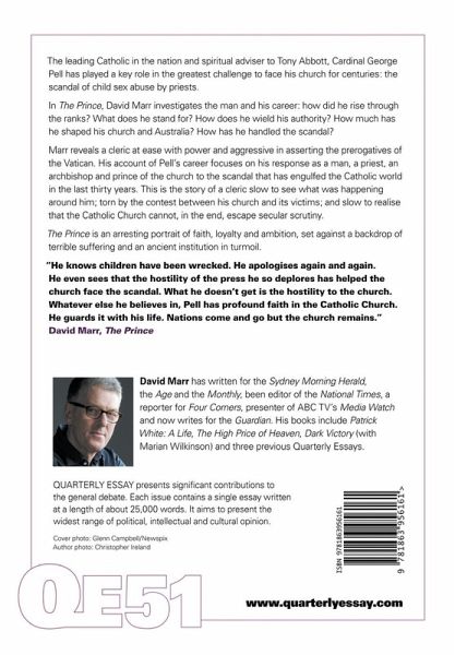 The leading Catholic in the nation and spiritual adviser to Tony Abbott, Cardinal George Pell has played a key role in the greatest challenge to face his church for centuries: the scandal of child sex abuse by priests. In The Prince, David Marr investigates the man and his career: how did he rise through the ranks? What does he stand for? How does he wield his authority? How much has he shaped his church and Australia? How has he handled the scandal? Marr reveals a cleric at ease with power and aggressive in asserting the prerogatives of the Vatican. His account of Pell's career focuses on his response as a man, a priest, an archbishop and prince of the church to the scandal that has engulfed the Catholic world in the last thirty years. This is the story of a cleric slow to see what was happening around him; torn by the contest between his church and its victims; and slow to realise that the Catholic Church cannot, in the end, escape secular scrutiny. The Prince is an arresting portrait of faith, loyalty and ambition, set against a backdrop of terrible suffering and an ancient institution in turmoil. "He knows children have been wrecked. He apologises again and again. He even sees that the hostility of the press he so deplores has helped the church face the scandal. What he doesn't get is the hostility to the church. Whatever else he believes in, Pell has profound faith in the Catholic Church. He guards it with his life. Nations come and go but the church remains." - David Marr, The Prince David Marr has written for the Sydney Morning Herald, the Age and the Monthly, been editor of the National Times, a reporter for Four Corners, presenter of ABC TV's Media Watch and now writes for the Guardian. His books include Patrick White: A Life, The High Price of Heaven, Dark Victory (with Marian Wilkinson) and three previous Quarterly Essays.