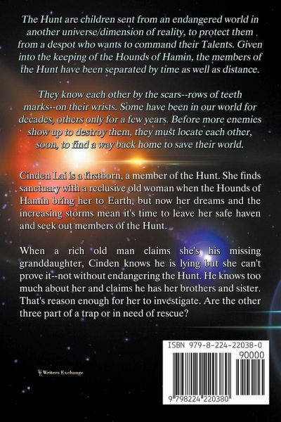 Cinden Lai is a firstborn, a member of the Hunt. She finds sanctuary with a reclusive old woman when the Hounds of Hamin bring her to Earth, but now her dreams and the increasing storms mean it's time to leave her safe haven and seek out members of the Hunt. When a rich old man claims she's his missing granddaughter, Cinden knows he is lying but she can't prove it--not without endangering the Hunt. He knows too much about her and claims he has her brothers and sister. That's reason enough for her to investigate. Are the other three part of a trap or in need of rescue? When four members of the Hunt come together, amazing things can happen...but they also uncover treachery, and learn a countdown has started: Time is running out for the Hunt and life on Earth can be fatal for them in more ways than one.