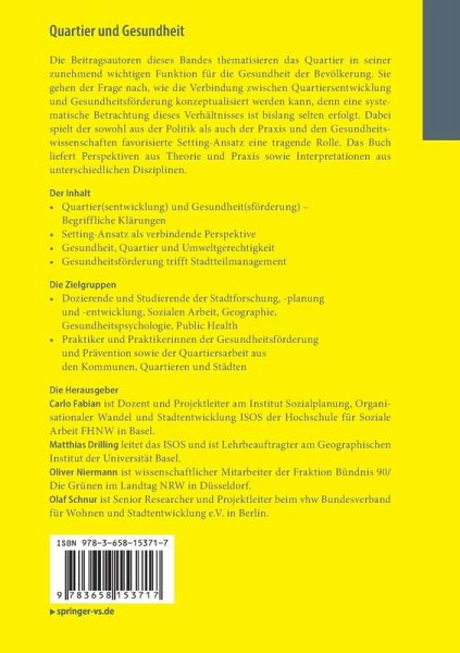 "... Die Herausgeber führen mit vielen Querverweisen auf akademisches Wissen in die wichtigsten Begriffe der Quartierforschung ein. Die Beiträge sind übersichtlich und für Einsteiger ausführlich genug erklärt. Sie bieten auch LeserInnen mit Vorwissen einen zwar nicht erschöpfenden, dennoch sehr gut aufbereiteten Zwischenstand zur Forschung im Bereich der Gesundheitsförderung und -erhaltung im urbanen Lebensraum." (Estia Zafirakis, in: AKP Fachzeitschrift für Alternative Kommunal Politik, Jg. 38, Heft 6, November-Dezember 2017)