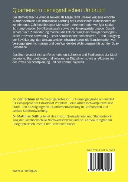 Der demografische Wandel genießt als Megatrend unserer Zeit eine erhöhte Aufmerksamkeit. Die strukturelle Alterung der Gesellschaft, insbesondere die zunehmende Zahl hochbetagter Menschen, eine mehr oder weniger starke Schrumpfung der Bevölkerungszahl sowie die Heterogenisierung der Gesellschaft durch Zuwanderung machen die Erforschung kleinräumiger demografischer Prozesse notwendig. Dieser Sammelband thematisiert z.B. den Rückgang der Bevölkerung, den Umbau sozialer Infrastrukturen, die Transformation von Versorgungseinrichtungen und den Wandel des Wohnungsmarkts auf der Quartiersebene.