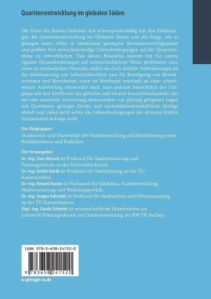 Eine Zukunft für die Vergangenheit? Potenziale und Herausforderungen der Erneuerung historischer Innenstädte in Schwellen- und Entwicklungsländern.- New governmental entities: Would they help overcome the challenge of slums in Egypt? The Role of the Informal Settlements Development Facility ISDF.- Umsiedlungspolitik und Siedlungsabrisse zum "Ersatz prekären Wohnraums" in Algerien - Hintergründe und Herausforderungen.- Urban Planning Lost In Translation. Koloniale Planungssysteme und die heutige Realität.- Netzanschlüsse nach Bedarf, Formalisierungen und Vervielfältigungen: Die Un-Ordnung der Wasserversorgung in Kimara, Dar es Salaam.- Die geplante Wohnungsversorgung der städtischen Armen. 15 Jahre Aufwertung informeller Siedlungen in Südafrika.- Slum Upgrading in Nairobi und Lima. Zwei alternative Strategien.- Upgrading und Verdrängung im Altstadtviertel San Telmo/Buenos Aires.- Entwicklung und Funktionsweise des lokalen Wohnungsmarktes der Villa 31 in Buenos Aires.- Crystallising actual neighbourhood development via public space, 'non-adversarial' political subjectivity and extra-institutional politics. The case of San José, Costa Rica.- Nextbengaluru. Co-kreative Quartiersentwicklung in Bengaluru, Shanthinagar, Indien.- Strategic Integration of Water Management within Spatial Planning. A view from Karachi and Jakarta.- Re-making Dadaocheng: Toward a New Era of Urban Regeneration in Taipei?