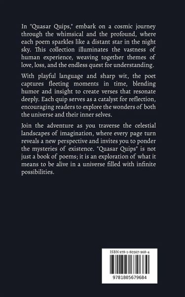 In "Quasar Quips," embark on a cosmic journey through the whimsical and the profound, where each poem sparkles like a distant star in the night sky. This collection illuminates the vastness of human experience, weaving together themes of love, loss, and the endless quest for understanding. With playful language and sharp wit, the poet captures fleeting moments in time, blending humor and insight to create verses that resonate deeply. Each quip serves as a catalyst for reflection, encouraging readers to explore the wonders of both the universe and their inner selves. Join the adventure as you traverse the celestial landscapes of imagination, where every page turn reveals a new perspective and invites you to ponder the mysteries of existence. "Quasar Quips" is not just a book of poems; it is an exploration of what it means to be alive in a universe filled with infinite possibilities.