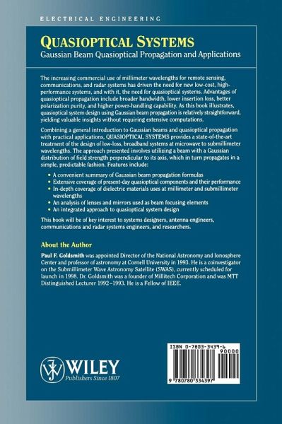 Electrical Engineering Quasioptical Systems Gaussian Beam Quasioptical Propagation and Applications The increasing commercial use of millimeter wavelengths for remote sensing, communications, and radar systems has driven the need for new low-cost, high-performance systems, and with it, the need for quasioptical systems. Advantages of quasioptical propagation include broader bandwidth, lower insertion loss, better polarization purity, and higher power-handling capability. As this book illustrates, quasioptical system design using Gaussian beam propagation is relatively straightforward, yielding valuable insights without requiring extensive computations. Combining a general introduction to Gaussian beams and quasioptical propagation with practical applications, Quasioptical Systems provides a state-of-the-art treatment of the design of low-loss, broadband systems at microwave to submillimeter wavelengths. The approach presented involves utilizing a beam with a Gaussian distribution of field strength perpendicular to its axis, which in turn propagates in a simple, predictable fashion. Features include: * A convenient summary of Gaussian beam propagation formulas * Extensive coverage of present-day quasioptical components and their performance * In-depth coverage of dielectric materials uses at millimeter and submillimeter wavelengths * An analysis of lenses and mirrors used as beam focusing elements * An integrated approach to quasioptical system design This book will be of key interest to systems designers, antenna engineers, communications and radar systems engineers, and researchers.