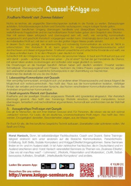 'Knallharte Rhetorik' statt 'Dummes Gelabere'Nichts ist leichter, als ungeprüfte Stammtischparolen lauthals in die Runde zu werfen. Behauptungen aufstellen, Schuldzuweisungen äußern und Gerüchte nachplappern, mag in lustiger Runde gelten. Im seriösen beruflichen Umgang überzeugen handfeste und überprüfbare Argumente. Geschickte, weiterführende Fragetechnik und ein nachvollziehbarer Roter Faden geben dem Gespräch eine Struktur.Wer mit seinen Ideen erfolgreich und überzeugend sein will, weiß, wie vernünftig kommunikativ ausgetauscht und geschickt rhetorisch vorgegangen werden kann. Unabhängig davon baut sich der Profi ein individuelles Profil auf, mit dem er sich von der großen trägen Masse positiv abhebt.In diesem Buch wird gezeigt, wie lebenswichtig und notwendig Kommunikation als solche ist. Nicht zu unterschätzen: Wer rhetorisch fit ist, kann gegen ihn eingesetzte Manipulationsversuche sofort durchschauen und diesen entgegentreten. Er erkennt unsachliche und unfachliche Einwände und weiß, wie er diese entkräften kann. Er ist dem Rhetorik-Laien deutlich im Vorteil.Schließlich tritt der Erfolgreiche aus dem Schatten der anonymen Masse. Er baut sein Profil auf und aus und wird damit - positiv - sichtbar. Die anderen sehen - "Da ist einer!" So hat der gut Handelnde die Chance, mit seinen Ideen andere zu überzeugen und zufrieden oder sogar glücklich zu werden.Die Erwartungen an die heutigen beruflich Aktiven haben sich deutlich verstärkt. Erwartet werden: Schnelligkeit, Überzeugungskraft und Präsenz. Nachdem die Online-Präsenz zugenommen hat, ergeben sich unerwartet andere und zusätzliche Schwerpunkte in der Übermittlung von Nachrichten.Erklimmen Sie deshalb mit uns die drei Stufen:1.Lebenswichtige Kommunikation statt Quasseln2.Gezielt eingesetzte Rhetorik statt Quatschen3.Aussagekräftiges Profil zeigen statt QuengelnEin Buch für alle, die ihre berufliche Gesprächs-Technik aufbauen, überarbeiten oder optimieren wollen. Viel Spaß und Erfolg.