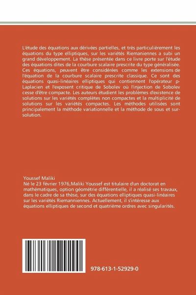 L'étude des équations aux dérivées partielles, et très particulièrement les équations du type elliptiques, sur les variétés Riemaniennes a subi un grand développement. La thèse présentée dans ce livre porte sur l'étude des équations dites de la courbure scalaire prescrite du type généralisée. Ces équations, peuvent être considérées comme les extensions de l'équation de la courbure scalaire prescrite classique. Ce sont des équations quasi-linéaires elliptiques qui contiennent l'opérateur p-Laplacien et l'exposent critique de Sobolev où l'injection de Sobolev cesse d'être compacte. Les auteurs étudient les problèmes d'existence de solutions sur les variétés complètes non compactes et la multiplicité de solutions sur les variétés compactes. Les méthodes utilisées sont principalement la méthode variationnelle et la méthode de sous et sur-solution.