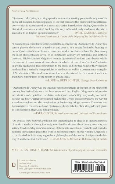 Antoine-Chrysostome Quatremère de Quincy was widely regarded as the pre-eminent art theorist of his day and exerted tremendous influence over the development of the arts in nineteenth-century France, publishing over twenty books over his career. Translated into English for the first time by Michel-Antoine Xhignesse, this 1837 treatise on imitation in the arts represents one of his major theoretical works. Quatremère de Quincy argues, against the prevailing opinion of the day, that artistic imitation aims at communicating the essence of the thing represented (ideal imitation), rather than merely faithfully reproducing its life appearance (real imitation). In order to communicate the essence, he argues, the artist must prioritize the contributions of her imagination over the choice and appearance of her model. This represented a significant departure from other accounts of ideal imitation, such as Batteux's or Winckelmann's, which instead advocated combining the best features of several different models.