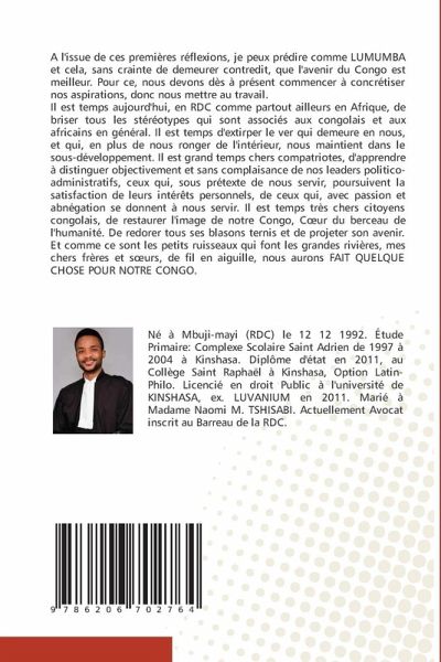 A l'issue de ces premières réflexions, je peux prédire comme LUMUMBA et cela, sans crainte de demeurer contredit, que l'avenir du Congo est meilleur. Pour ce, nous devons dès à présent commencer à concrétiser nos aspirations, donc nous mettre au travail.Il est temps aujourd'hui, en RDC comme partout ailleurs en Afrique, de briser tous les stéréotypes qui sont associés aux congolais et aux africains en général. Il est temps d'extirper le ver qui demeure en nous, et qui, en plus de nous ronger de l'intérieur, nous maintient dans le sous-développement. Il est grand temps chers compatriotes, d'apprendre à distinguer objectivement et sans complaisance de nos leaders politico-administratifs, ceux qui, sous prétexte de nous servir, poursuivent la satisfaction de leurs intérêts personnels, de ceux qui, avec passion et abnégation se donnent à nous servir. Il est temps très chers citoyens congolais, de restaurer l'image de notre Congo, Coeur du berceau de l'humanité. De redorer tous ses blasons ternis et de projeter son avenir. Et comme ce sont les petits ruisseaux qui font les grandes rivières, mes chers frères et soeurs, de fil en aiguille, nous aurons FAIT QUELQUE CHOSE POUR NOTRE CONGO.