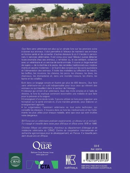Que faire sans vétérinaire est plus qu'un simple livre sur les premiers soins à donner aux animaux. Il doit permettre à l'éleveur de maintenir ses animaux en bonne santé et de conseiller d'autres éleveurs là où il n'existe ni personnels ni services vétérinaires. Il est conçu pour que l'éleveur puisse détecter toute anomalie chez ses animaux, y remédier ou, le cas échéant, collaborer avec un vétérinaire et un service de santé animale. Il couvre un large éventail de sujets - de la diarrhée à la peste, des remèdes traditionnels aux médicaments et vaccins modernes - et fournit des conseils sur les soins quotidiens et l'alimentation des animaux. Il traite des maladies qui affectent les boeufs, les buffles, les moutons, les chèvres, les porcs, les chevaux, les ânes, les chameaux, les dromadaires et, dans une moindre mesure, les chiens, les lapins et les volailles. Ecrit dans un langage simple et illustré par plus de 400 dessins, Que faire sans vétérinaire est un outil indispensable pour tous ceux qui élèvent des animaux ou qui travaillent dans le secteur de l'élevage. - L'éleveur qui vit loin d'un vétérinaire. Avec des mots simples et à l'aide de dessins, le livre lui explique comment reconnaître une maladie et que faire pour la prévenir et la soigner. - L'enseignant d'une école rurale. Il pourra utiliser ce livre pour organiser une formation sur la santé animale et, d'une manière générale, pour élaborer un enseignement agricole. - Le vulgarisateur, l'assistant vétérinaire ou tout autre technicien, qui conseille les éleveurs. Il trouvera dans ce livre les médicaments et les traitements les plus utiles pour chaque maladie, ainsi que ceux qui sont inutiles voire dangereux.
