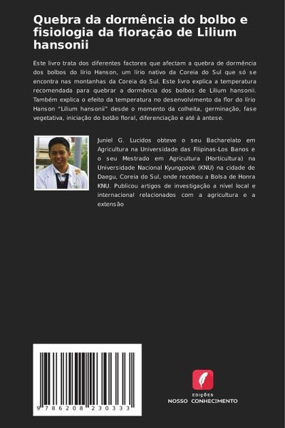 Este livro trata dos diferentes factores que afectam a quebra de dormência dos bolbos do lírio Hanson, um lírio nativo da Coreia do Sul que só se encontra nas montanhas da Coreia do Sul. Este livro explica a temperatura recomendada para quebrar a dormência dos bolbos de Lilium hansonii. Também explica o efeito da temperatura no desenvolvimento da flor do lírio Hanson "Lilium hansonii" desde o momento da colheita, germinação, fase vegetativa, iniciação do botão floral, diferenciação e até à antese.