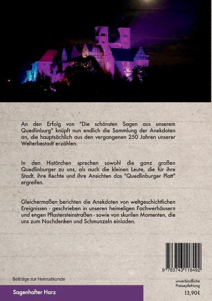 An den Erfolg von "Die schönsten Sagen aus unserem Quedlinburg" knüpft nun endlich die Sammlung der Anekdoten an, die hauptsächlich aus den vergangenen 250 Jahren unserer Welterbestadt erzählen. In den Histörchen sprechen sowohl die ganz großen Quedlinburger zu uns, als auch die kleinen Leute, die für ihre Stadt, ihre Rechte und ihre Ansichten das "Quedlinburger Platt" ergreifen. Gleichermaßen berichten die Anekdoten von weltgeschichtlichen Ereignissen - geschrieben in unseren heimeligen Fachwerhäusern und engen Pflastersteinstraßen - sowie von skurilen Momenten, die uns zum Nachdenken und Schmunzeln einladen.