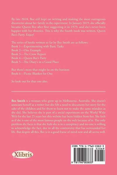 By late 2018, Bee still kept on writing and making the most outrageous discoveries about her family in the experiment. In January 2019, she officially became Queen Bee after first suggesting it in 1979, and she's never been happier with her theories. This is why the fourth book was written, Queen Bee's Party. Enjoy! The series of books written so far by Bee Smith are as follows: Book 1-Experimenting with Basic Tasks Book 2-One Example Book 3-The Crow Report Book 4-Queen Bee's Party Book 5-The Diary's in a Good Place But there's more that might be on the horizon: Book 6-Picnic Blanket for One So look out for that one also.…mehr
