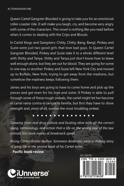 Queen Cartel Gangster Blooded is going to take you for an emotional roller-coaster ride. It will make you laugh, cry, and become very angry with some of the characters. This novel is nothing like you read before when it comes to dealing with the Crips and Bloods. In Cartel Kings and Gangsters: Chitty, Chitty, Bang, Bang!, Pinkey and Suzie were just two good girls that love bad guys. In Queen Cartel Gangster Blooded, Pinkey and Suzie take it to a whole different level with Shitty and Tanya. Shitty and Tanya just don?t know how to leave well enough alone, but they are out for blood. They are going for some in one way or another. Pinkey and Suzie left New York City and moved up to Buffalo, New York, trying to get away from the madness, but somehow the madness keeps following them. James and his boys are going to have to come home and pick up the pieces and get even for his love and sister. If Pinkey is able to pull through some of these rough ordeals, the cartel might let her become el cartel raina contra el sangre la familia, but first they have to show strength and, most of all, survive the most troubling ordeal.