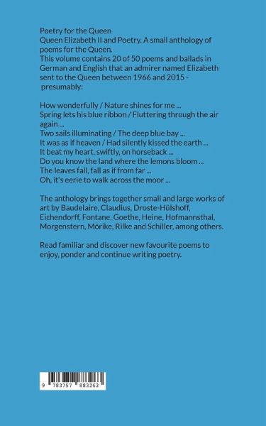 Poetry for the QueenQueen Elizabeth II and Poetry. A small anthology of poems for the Queen.This volume contains 20 of 50 poems and ballads in German and English that an admirer named Elizabeth sent to the Queen between 1966 and 2015 - presumably:How wonderfully / Nature shines for me ...Spring lets his blue ribbon / Fluttering through the air again ...Two sails illuminating / The deep blue bay ...It was as if heaven / Had silently kissed the earth ...It beat my heart, swiftly, on horseback ...Do you know the land where the lemons bloom ...The leaves fall, fall as if from far ...Oh, it's eerie to walk across the moor ...The anthology brings together small and large works of art by Baudelaire, Claudius, Droste-Hülshoff, Eichendorff, Fontane, Goethe, Heine, Hofmannsthal, Morgenstern, Mörike, Rilke and Schiller, among others.Read familiar and discover new favourite poems to enjoy, ponder and continue writing poetry.