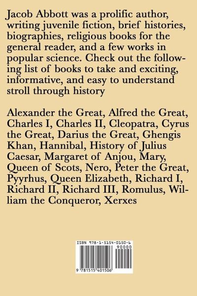 Jacob Abbott was a prolific author, writing juvenile fiction, brief histories, biographies, religious books for the general reader, and a few works in popular science. Check out the following list of books to take and exciting, informative, and easy to understand stroll through history Alexander the Great, Alfred the Great, Charles I, Charles II, Cleopatra, Cyrus the Great, Darius the Great, Ghengis Khan, Hannibal, History of Julius Caesar, Margaret of Anjou, Mary, Queen of Scots, Nero, Peter the Great, Pyyrhus, Queen Elizabeth, Richard I, Richard II, Richard III, Romulus, William the Conqueror, Xerxes