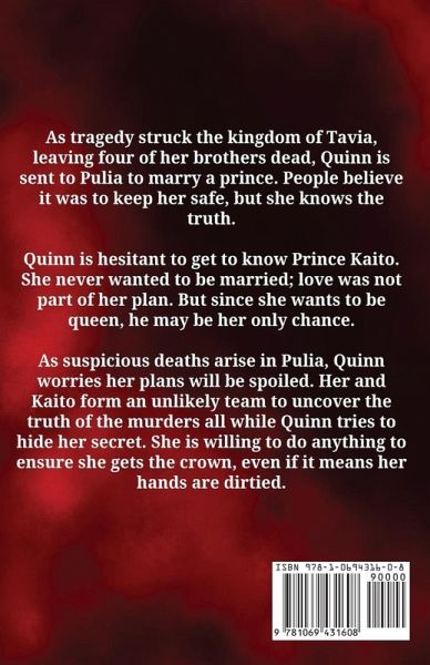After tragedy struck the kingdom of Tavia, leaving four of her brothers dead, Quinn is sent to Pulia to marry a prince. People believe it was to keep her safe, but she knows the truth. Quinn is hesitant to get to know Prince Kaito. She never wanted to be married; love was not a part of her plan. But since she wants to be queen, he may be her only chance. As suspicious deaths arise in Pulia, Quinn worries her plans will be spoiled. Her and Kaito form an unlikely team to uncover the truth of the murders all while Quinn tries to hide her secret. She is willing to do anything to ensure she gets the crown, even if it means her hands are dirtied.
