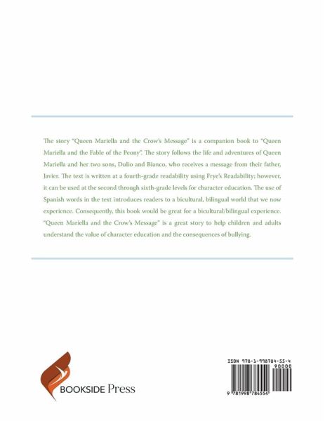 The story "Queen Mariella and the Crow's Message" is a companion book to "Queen Mariella and the Fable of the Peony". The story follows the life and adventures of Queen Mariella and her two sons, Dulio and Bianco, who receives a message from their father, Javier. The text is written at a fourth-grade readability using Frye's Readability; however, it can be used at the second through sixth-grade levels for character education. The use of Spanish words in the text introduces readers to a bicultural, bilingual world that we now experience. Consequently, this book would be great for a bicultural/bilingual experience. "Queen Mariella and the Crow's Message" is a great story to help children and adults understand the value of character education and the consequences of bullying.