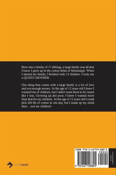 Born into a family of 17 siblings, a large family was all that I knew. I grew up in the cotton fields of Mississippi. When I started my family, I finished with 13 children. I truly am a QUEEN MOTHER. One thing that comes with a large family is a lot of love and not enough money. At the age of 12 years old, I knew I wanted lots of children, but I didn't want them to be raised like I was. Growing up dirt poor, I knew I wanted more than that for my children. At the age of 12 years old, I could pick 200 lbs of cotton in one day, but I made up my mind then... not my children!